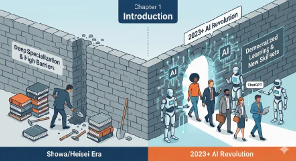 しかし、2023年以降のAI革命は、この前提を根底から変えつつあります。ChatGPTをはじめとする生成AIの登場により、専門外の分野を学ぶハードルが劇的に下がったのです。