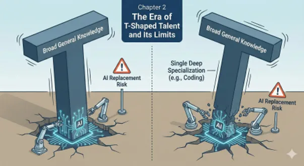 しかし、AI時代においてT字型人材には限界があります。単一の専門性に依存するリスクが高まっているのです。AIが特定分野の作業を代替し始めると、その専門性だけでは差別化が難しくなります。例えば、コーディングに特化したエンジニアは、AIがコード生成を支援する時代においてどう価値を発揮するのか、再定義を迫られています。