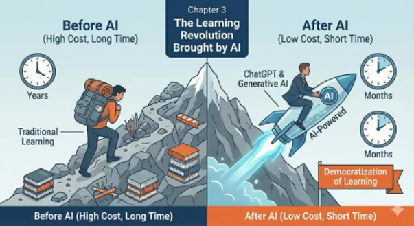AI以前の世界では、専門外の分野を学ぶには膨大なコストがかかりました。独学で書籍を読み漁る、専門学校に通う、実務経験を積む。いずれも年単位の時間と多大な労力を要したのです。