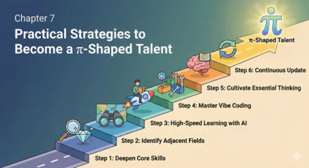 一つの専門性を深めるだけでなく、複数の専門性を組み合わせるπ字型人材へ。そして、バイブコーディングで自分専用ツールを作る力を身につけ、本質的思考力でAIを正しく使いこなす。この三位一体が、これからの時代を生き抜く武器になりま す。