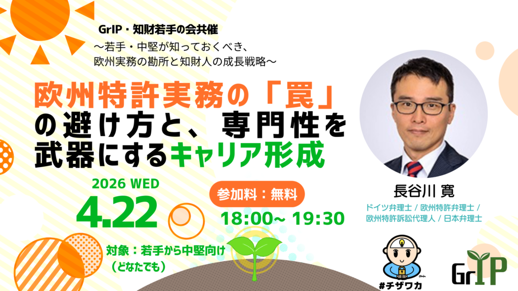 欧州特許実務で日本企業が陥りやすい「無意識のズレ」を実例で解説。長谷川 寛 氏が日本からドイツに渡り、専門性を築きキャリアを拓いた実体験も共有します。「知財若手の会」藤原氏進行の対話型で、若手視点のリアルな悩みとプロの知見を接続するオンラインセミナーです。